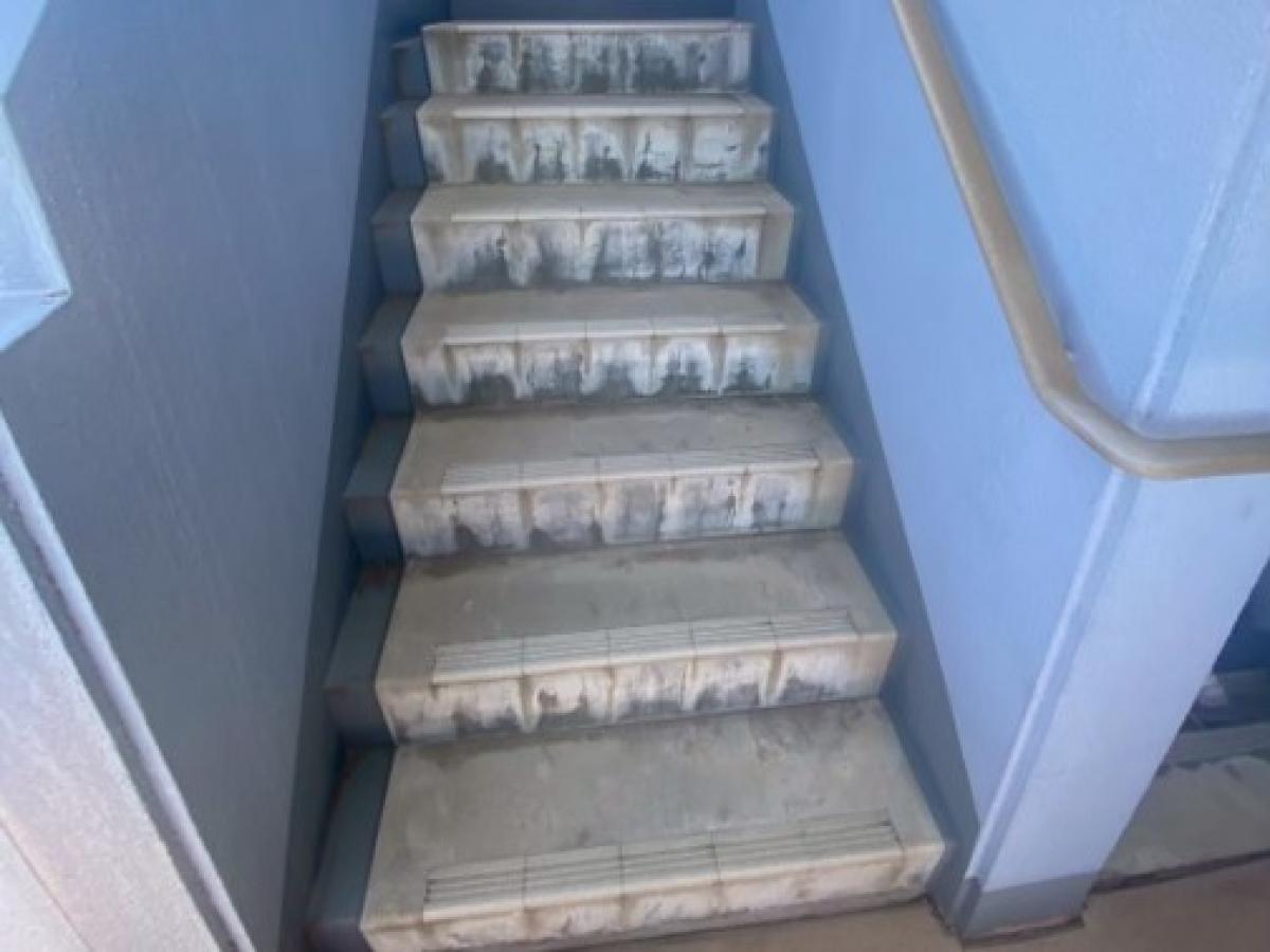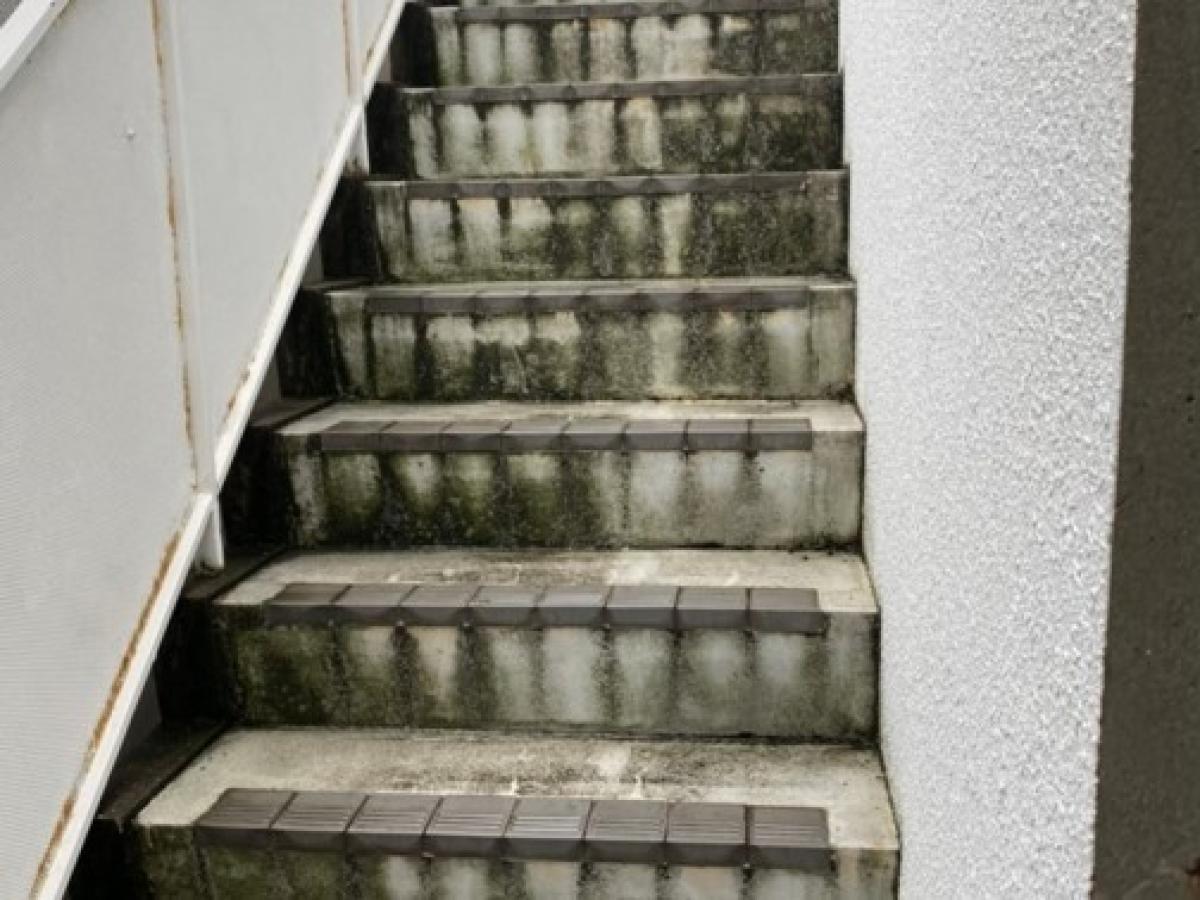 Before: 長年の汚れ・雨染み・ひび割れが目立ち、入居者様からも「滑る」との声が。